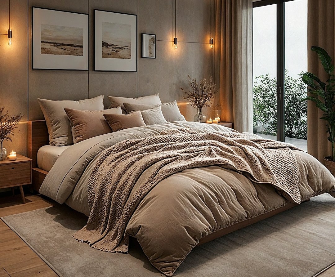 Décor items, however, really help in bringing some character and warmth into the bedroom without straying too far from minimalism. Textiles are basic needs, which I have placed with plush throw blankets, cushions, and bedding in soft, neutral colors to really enhance comfort. Rugs fashioned out of natural fibers such as wool or jute give texture and warmth to the hardwood or laminate floor, which contributes to an atmosphere of coziness.