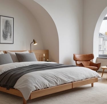 My Scandinavian-inspired bedroom is very much concerned with cleaning up clutter and paring down only to the very essentials. The style brings serenity to the room and makes it more functional. Natural light is one of the basic elements, and I have given it structure with large windows and barely-there curtains, a nod to that Scandinavian philosophy of 'bringing the outside in.' White walls act as a canvas that amplifies light, providing a serene backdrop for other design elements.