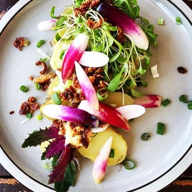 A playful take on the traditional Swedish dish of potatoes and onions, elevated with caviar and a smoked cream