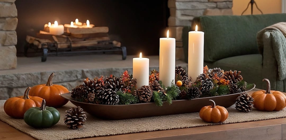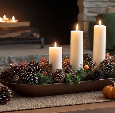 Nature-Inspired Centrepiece: On the coffee table, I'll create a centrepiece using a low, wide bowl filled with pine cones, mini pumpkins, and cinnamon sticks. A few tealight candles nestled among these elements will add a warm glow during evening gatherings.