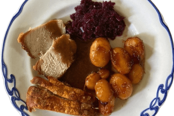 Flæskesteg is traditionally served with boiled or caramelized potatoes, red cabbage (rødkål), and a simple cucumber salad. This makes for a hearty and satisfying meal, perfect for festive occasions.