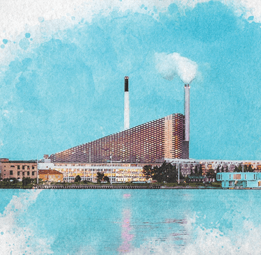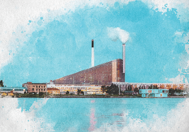 The CopenHill digital watercolor illustration celebrates the innovative spirit of Copenhagen’s iconic waste-to-energy plant and recreational facility. Rendered in delicate washes, the piece transforms the industrial structure into a dynamic landscape of curves and angles, where vibrant greens of the adjacent park contrast with the muted grays of modern architecture. The artwork captures the juxtaposition of nature and technology, highlighting the building’s unique design that doubles as a ski slope. Gentle gradients and soft textures evoke a feeling of movement and transformation, reflecting Copenhagen’s commitment to sustainability and creativity. This piece invites viewers to rethink urban spaces, imagining a future where practicality meets artistic flair and environmental consciousness seamlessly.