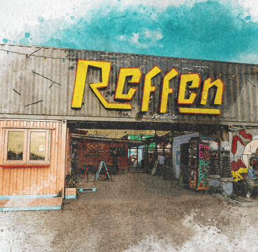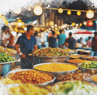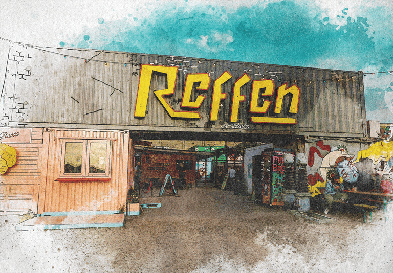 This digital watercolor celebrates the lively, eclectic energy of Reffen Street Food in Copenhagen. Rendered with bold, fluid strokes and a vibrant palette, the piece captures the hustle and bustle of food trucks and outdoor dining, juxtaposed against an urban backdrop. The artwork uses a mix of warm tones and cool accents to highlight the diverse culinary offerings and the multicultural ambiance that defines the space. Intricate details depict chefs in action, aromatic spices wafting in the air, and vibrant signage that invites food lovers to explore. The overall composition exudes a sense of community and creative culinary innovation, transforming a casual street scene into a vivid tapestry of flavor, culture, and artistic expression that perfectly encapsulates the dynamic spirit of Copenhagen’s street food scene.