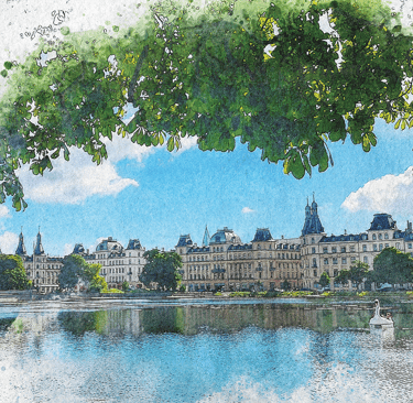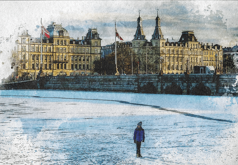 This digital watercolor captures the serene beauty of a Copenhagen winter, where city lakes are transformed into glistening sheets of ice. The cool palette of blues, grays, and soft whites creates an atmosphere of calm and quiet, punctuated by the delicate reflections of snow-covered architecture. The gentle strokes suggest a soft snowfall, and the subtle interplay of light adds depth and texture to the frozen scene. The illustration invites viewers to experience the tranquil beauty of winter in the city, where urban life slows down and nature takes center stage. It is a visual meditation on the stillness and quiet magic that the colder months bring to Denmark’s vibrant capital, offering both nostalgia and peace.