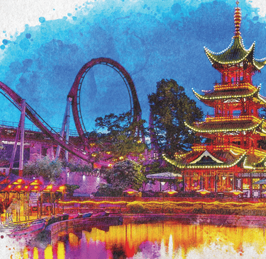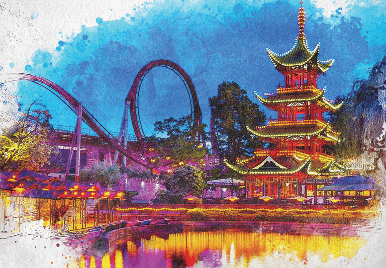 The digital watercolor portrayal of Tivoli is a celebration of whimsy and enchantment in the heart of Copenhagen. The illustration bursts with lively colors and fluid brushstrokes that capture the vibrant energy of the amusement park. Twinkling lights, swirling rides, and lush garden scenes are rendered in playful hues, evoking a sense of nostalgia and childlike wonder. Every detail, from the intricate ironwork of the roller coaster to the delicate petals of garden blooms, is painted with a soft, dreamlike quality that blurs the line between fantasy and reality. This piece not only celebrates the magic of Tivoli but also captures the enduring spirit of joy and creativity that defines Danish culture, inviting viewers to step into a world of imagination.