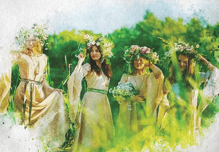 This digital watercolor captures the exuberance and cultural richness of a Midsommar dance celebration in Denmark. The illustration is filled with lively brushstrokes and a vibrant spectrum of colors that evoke the warmth and communal spirit of the festival. Figures in traditional attire are depicted gracefully twirling amidst a backdrop of blooming meadows and radiant summer light. The soft gradients and fluid lines convey a sense of motion and joy, capturing the essence of a night filled with music, laughter, and timeless traditions. This artwork serves as a heartfelt tribute to the enduring cultural heritage of Denmark, inviting viewers to feel the magic of Midsommar and the unity it brings, as nature and human celebration merge in a beautiful display of life and light.