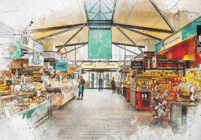 The digital watercolor illustration of Torvehallerne transforms the bustling market into a vibrant canvas of colors and textures. With a mix of soft washes and energetic strokes, the artwork captures the lively atmosphere of this modern food hall, where gourmet delights and local produce come together in a feast for the senses. The piece features a balanced composition of warm and cool hues, reflecting the interplay of natural light and contemporary architecture. Delicate details bring to life the variety of stalls, each exuding its unique character and charm. This painting invites viewers to explore the sensory experience of Torvehallerne, celebrating its role as a meeting point for food enthusiasts and a symbol of Copenhagen’s innovative culinary culture, all rendered with an artistic touch that is both inviting and evocative.